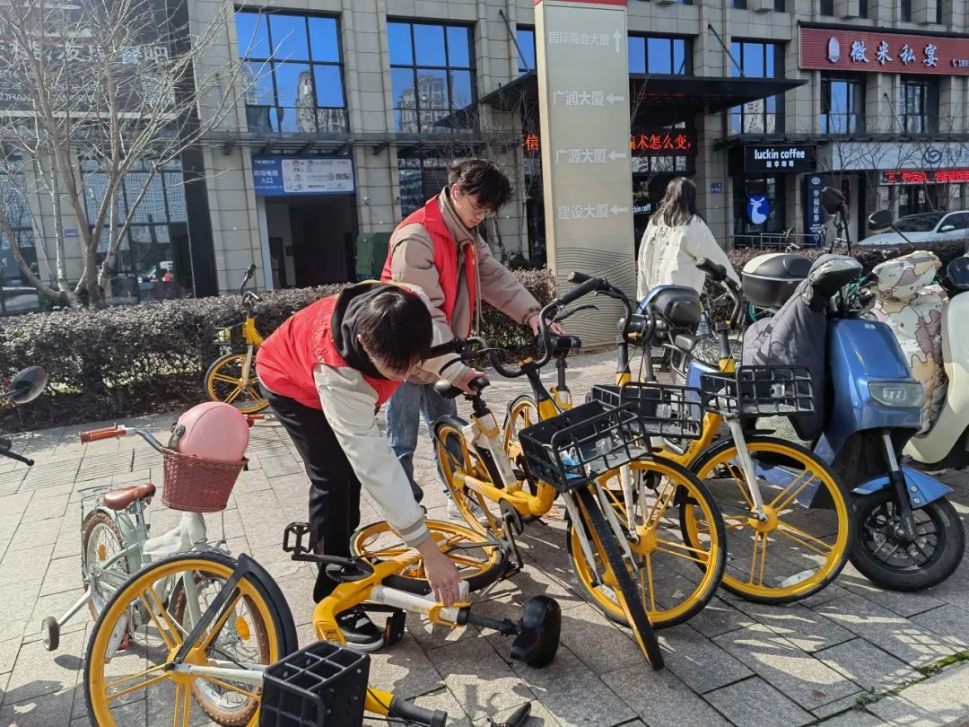 志愿者们前往瓯江红中央商务区的城市驿站和周边道路,手持清洁工具,对周边人行道、绿化带等环境卫生进行清扫;整理道路周边共享自行车区域,整理摆放不规范的非机动车,劝阻占用堵塞消防通道现象,倡导市民文明使用公共设施。志愿者们发扬不怕累、不怕脏的精神,分工合作,以实际行动为文明城市创建助力添彩。